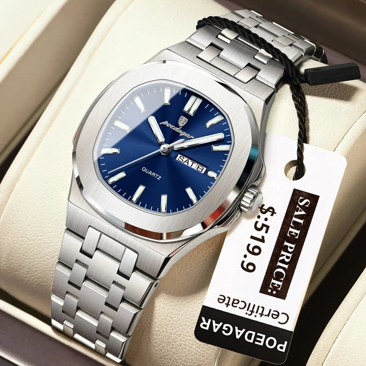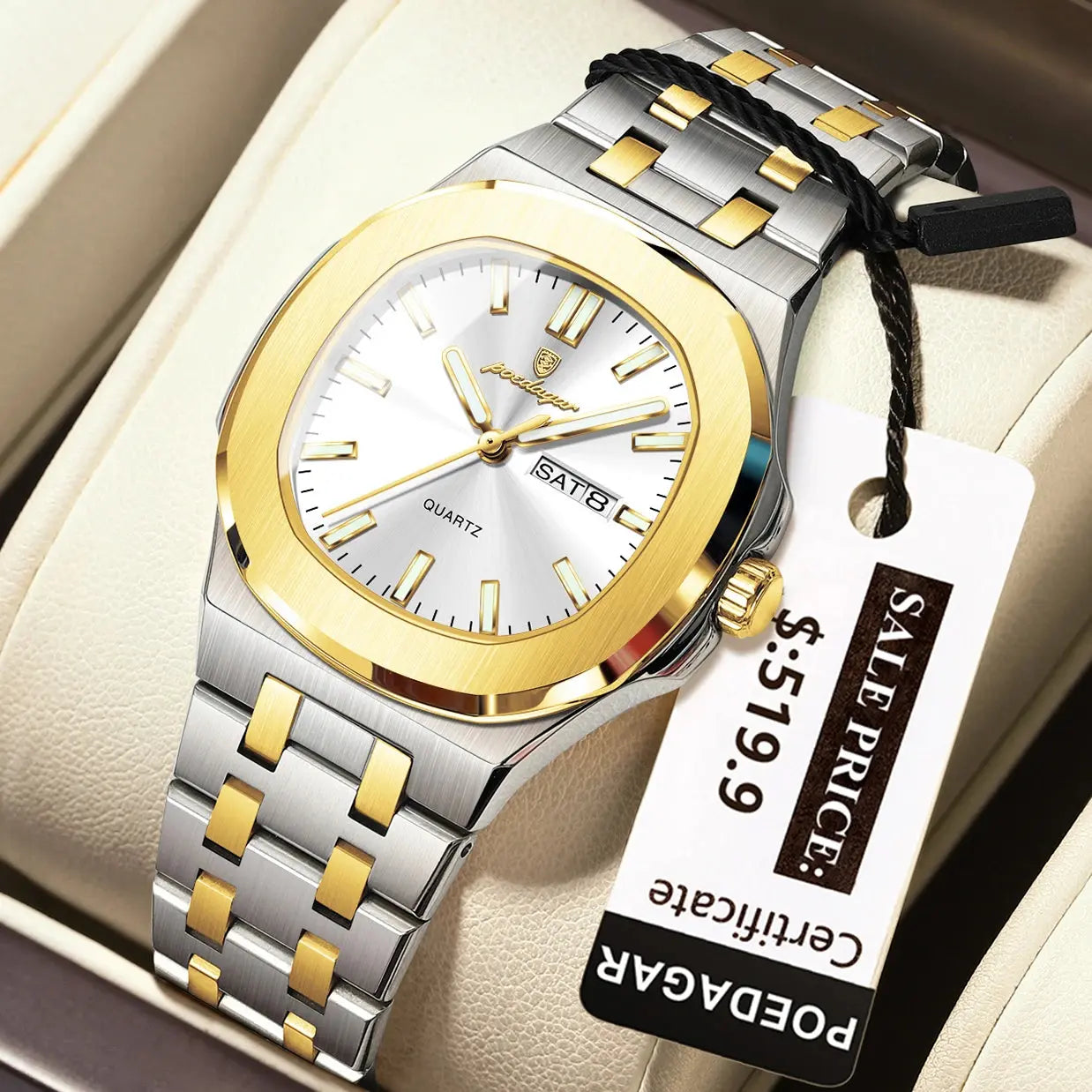 POEDAGAR women's watch with square case. Stainless steel bracelet and quartz movement for everyday use.